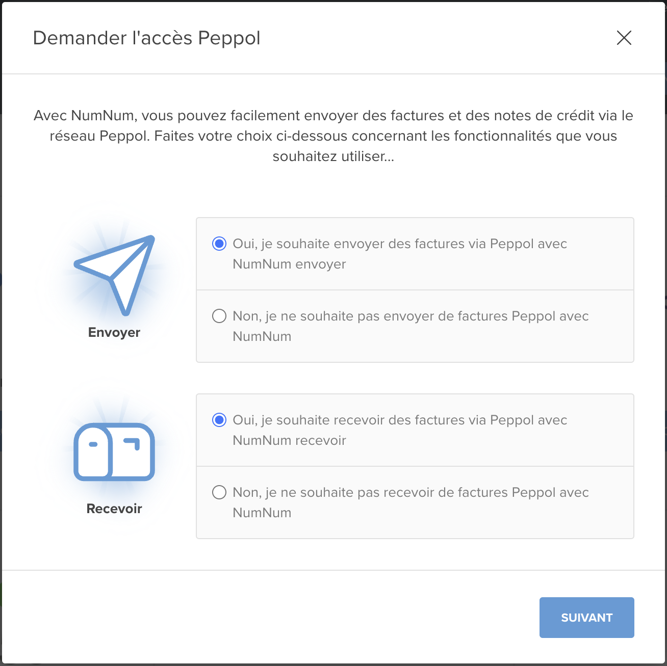 Vous pouvez activer Peppol au moment d’envoyer une facture ou une note de crédit :