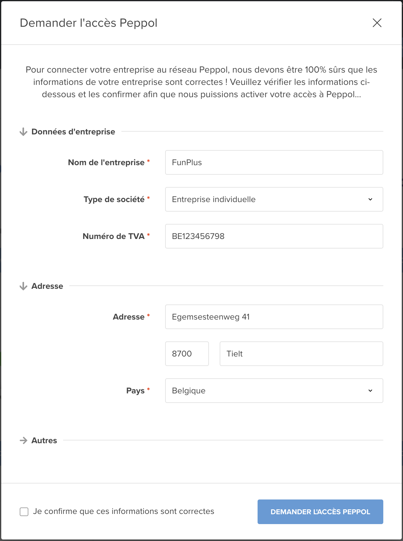 - La fenêtre “Demander un accès Peppol” s’ouvrira.
