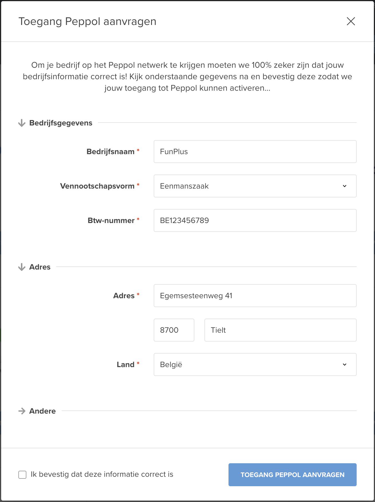 - Het venster “Toegang Peppol aanvragen” verschijnt.