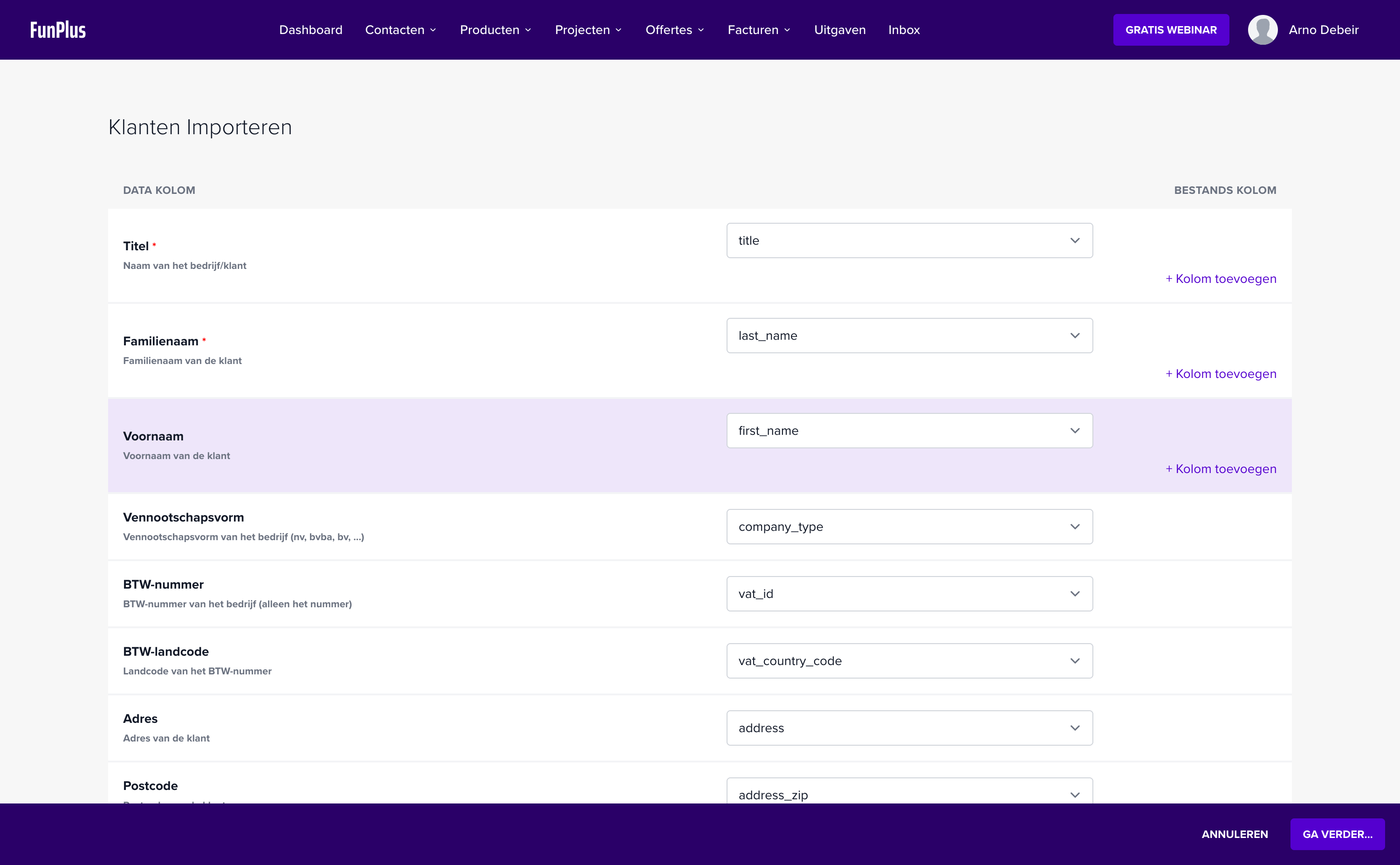 Na het uploaden van je bestand verschijnt het scherm voor kolomkoppeling: